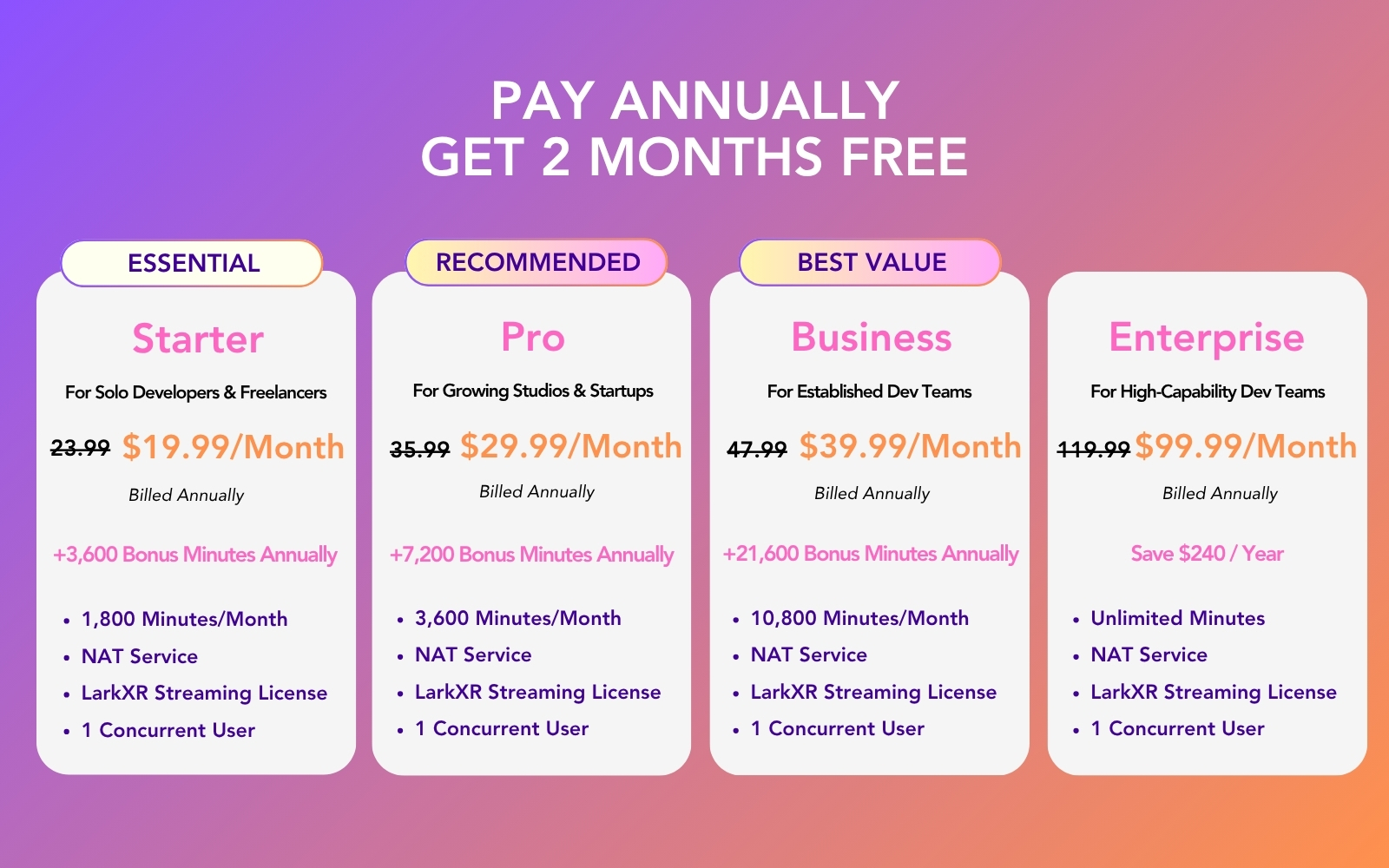 Pricing: All prices shown are per Concurrent User (CCU). Custom concurrency options available by contacting sales.